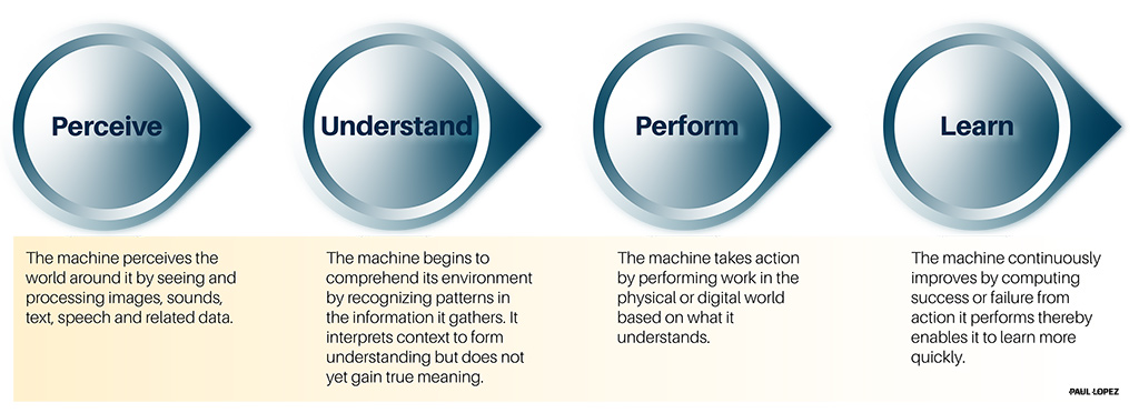 In threat intelligence, numerous external databases such as the National Vulnerability Database (NVD) are used with automation to arrive at a CVSSv3 (Common Vulnerability Scoring System) score, for example. Insider threat detection is one area using more advanced forms of machine learning, such as Deep Neural Networks (DNNs) and Recurrent Neural Networks (RNNs). The algorithm training enables it to recognize activity that is characteristic of an active user and can concurrently determine whether their behavior is normal or abnormal – all in real-time. The cybersecurity machine is doing an excellent job of Perceiving and Understanding based on ML capability frameworks. However, only by Performing actions can the machine determine if it succeeds or fails, thereby enabling it to Learn more quickly. A failure would be a false positive of a security event.