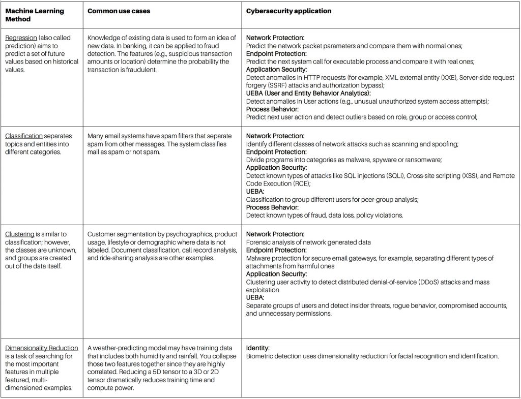 The table below summarizes just a few examples of where machine learning has already been hard at work in contemporary cybersecurity applications.
